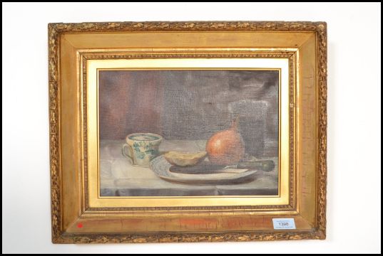 A 19th century oil on canvas painting still life study of a glass of wine with onion and cheese on plate being signed and dated to the corner 1886. Measures 48cms  x  39cms ( frame)