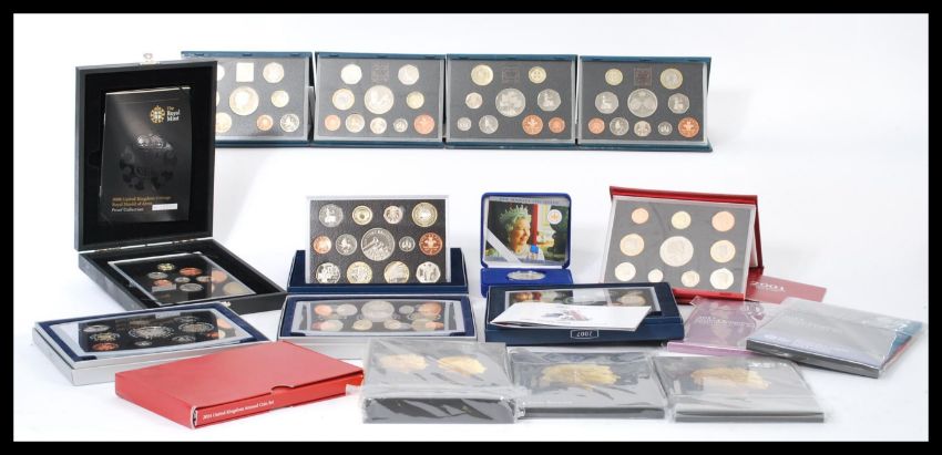 A collection of boxed Royal Mint coin sets to include 2006. 2007, two 2000, 2001, 1997, 1996, 1998, 2013, 2014, 2017, 1997, The fourth x2 The fourth and fifth, 2008 etc. Please see images.