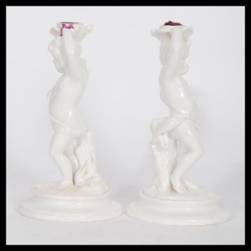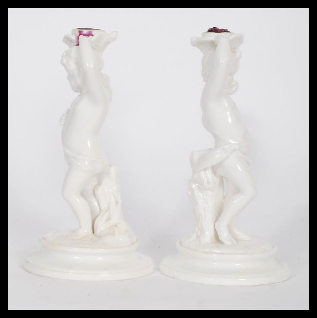 A pair of 19th century ceramic table taper candlesticks in the form of cherubs holding cornucopia shells raised on circular bases. Measures 17cms high.