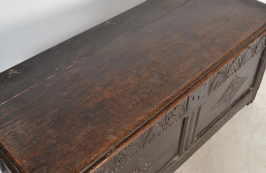 An 18th century West Country oak coffer chest box being raised on stile legs with fielded panels with carved geometric arches, flared hinged top above.