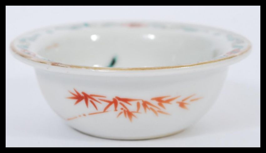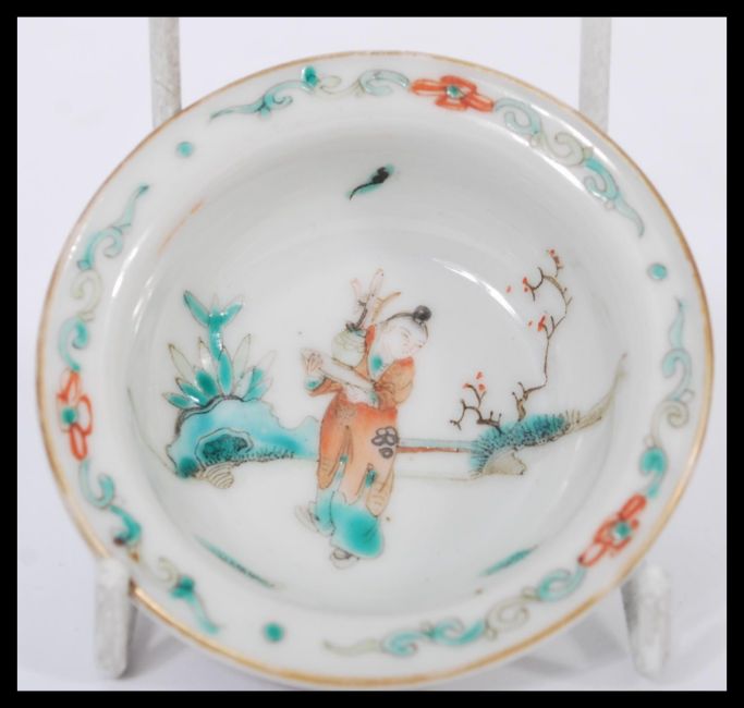 A 19th century Chinese finger bowl having a Famille verte decoration with hand painted scene of a maiden holding a vase with scrolled borders. Measures 8cms wide.