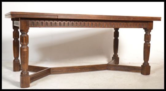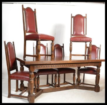 A large Jaycee Jacobean revival extending oak refectory dining table together with a set of 12 oak and leather dining chairs. The large table with turned legs united by stretchers, good leather seats and back rests to the chairsa