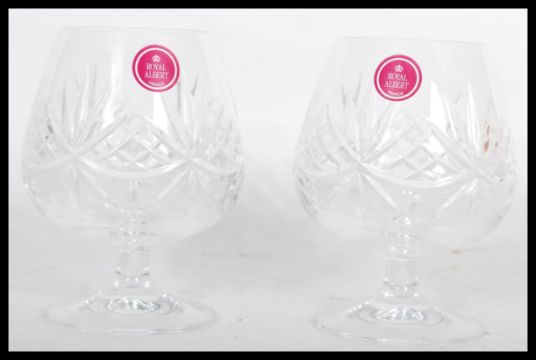 A group of Royal Albert crystal cut glass glassware set in the Amersham pattern to include a pair of Rummers, Schooner Brandy glasses and flute champagne. All on original boxes. Highest measures 20 cm.