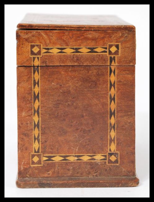 An 19th century walnut inlaid  gaming card box having inlaid decoration of penguins. Of square form with inlaid panels and hinged top. Please see images.