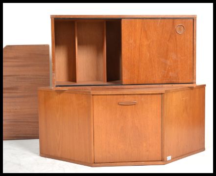 A collection of mid century retro Avalon / Ladderax teak wood units comprising corner cabinet, sliding door cabinet and shelves etc