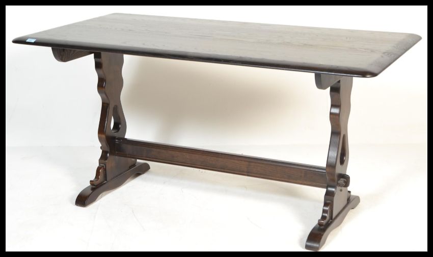 A 20th century Ercol beech and elm wood refectory dining table being raised on shaped supports with large top having splayed legs to the base. Measures: 75cm high x 155cm wide x 82cm deep.
