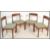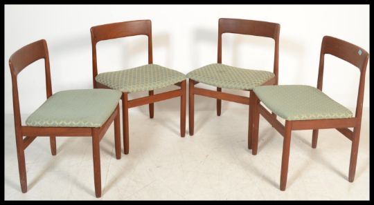 A set of four vintage retro 20th century teak wood dining chairs by Younger UK having shaped back rests raised on straight round legs. Measures: 76cm high x 49cm wide x 45cm deep.