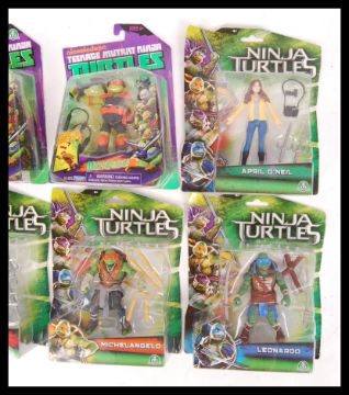 A collection of original boxed Giochi Preziosi made Nickelodeon TMNT Teenage Mutant Ninja Turtles carded action figures to include Michelangelo and Ooze Chuckin' Mikey from the TV series and Leonardo , Michelangelo , Raphael and April O'Neil from the movie.
