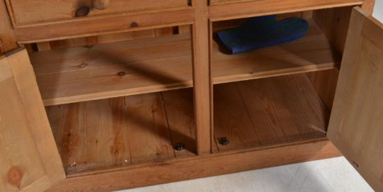A good quality antique style country pine dresser raised on a plinth base with a series of short drawers above cupboards. Above an upright gallery plate rack. Dismantles to 2 pieces