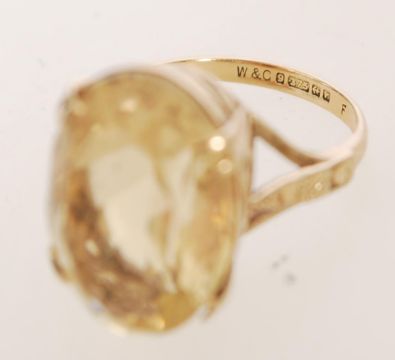 A hallmarked 9ct gold ring having a large central faceted citrine stone set in open gallery setting with prong mounts. Weight 5.4g. Size K.
