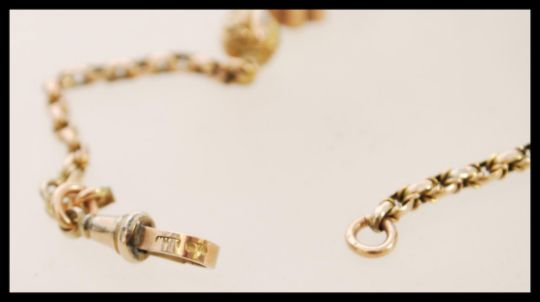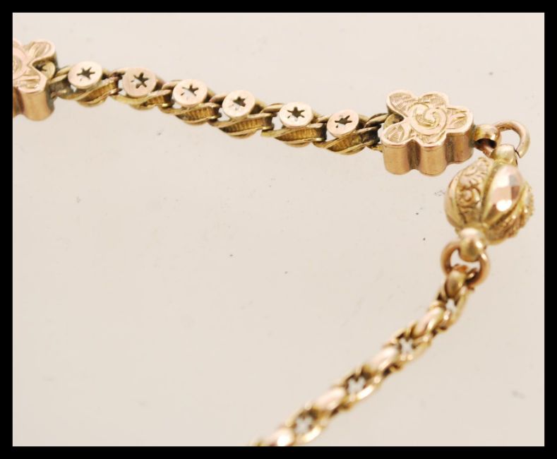 A Victorian 19th century 9ct gold bracelet with shaped mesh links applied with decorative ball and clover spacers, c-clasp to one end. Stamped 9ct. Total weight 6.6g / length 21cms