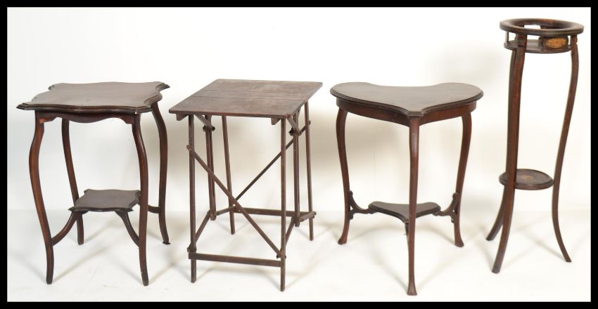 A collection of vintage early 20th Century Edwardian furniture to include two mahogany centre tables, fold up occasional table with an inlaid tourchere / plant stand.
