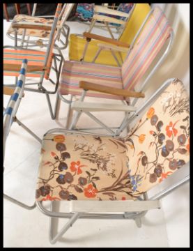 A collection of vintage retro 20th Century folding deck / garden chairs, tubular frames with canvas seats.  Measures: 80cm high x 56cm wide x 50cm deep.