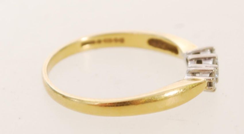 A hallmarked 18ct gold and diamond three stone ring. Diamonds approx 25pts. Hallmarked London. Weight 2.4g. Size O.5.