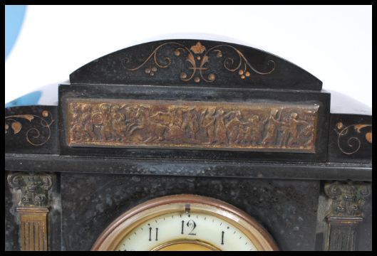 A 19th century Victorian slate marble mantel clock having a white enamel chapter ring with Arabic numerals and faceted hands