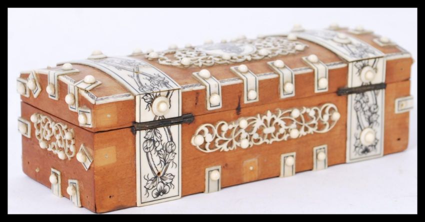 A 19th century Indian fruit wood anglo - colonial box having inlaid ivory panels depicting flowers and deities Hinged lid opening to reveal sectional interior.