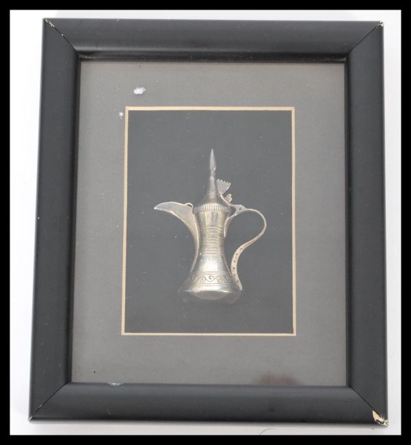 A silver white metal Islamic Dallah coffee pot in a frame along with a cased silver hallmarked vanity set with brushes comb etc.