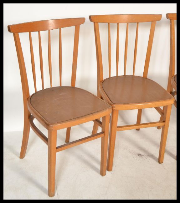A set of four vintage retro 20th century wooden dining kitchen utility chairs raised on tapered supports with rail backs.