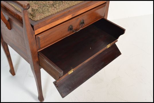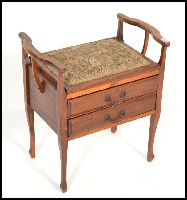 A vintage early 20th century Edwardian piano stool having tow pull out fold front drawers with tapestry type seat. Measures 62 cm x 56 cm x 36 cm.