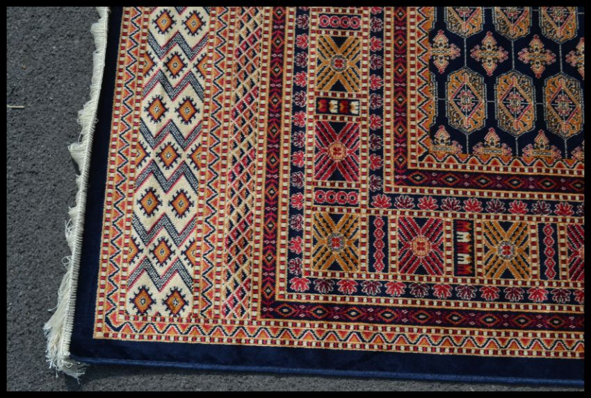 A 20th century Persian Bokhara rug having central multiple medallions raised on blue and red ground with tassled ends. Measures 2.80 x 2.0m