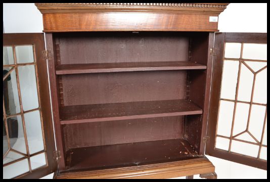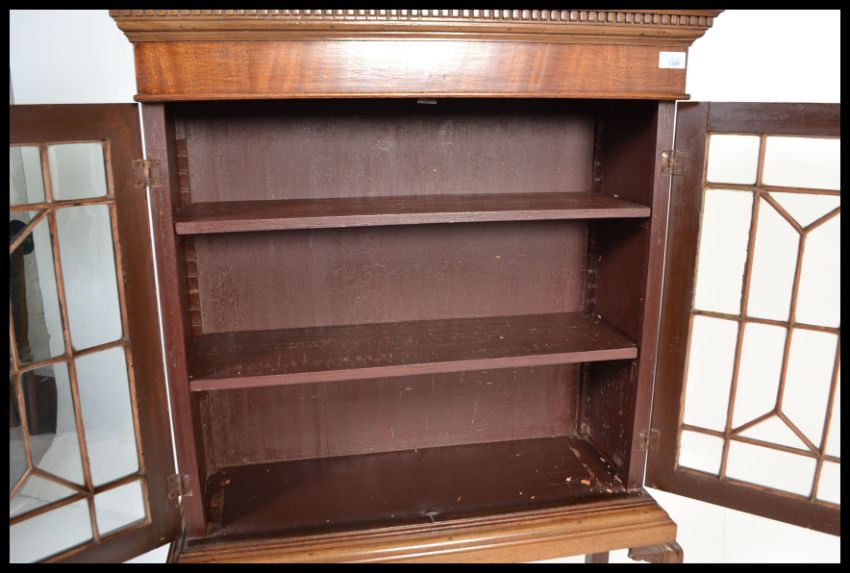 An Edwardian mahogany display cabinet on stand having cross stretchers to the base, display cabinet atop with astragal glazed doors