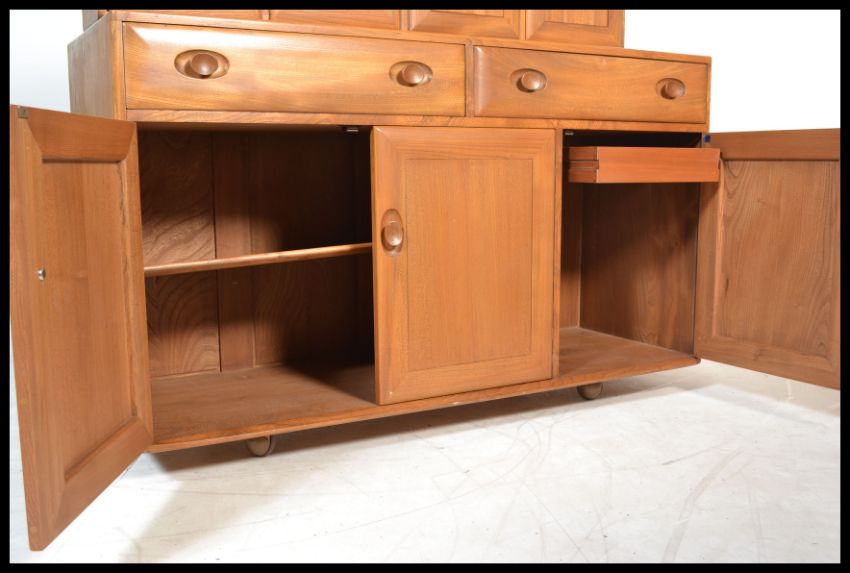 A vintage retro 20th century Ercol Beech and Elm sideboard highboard credenza unit. Raised on castors having three cupboards with two drawers and a four cupboard unit atop opening to reveal glass shelves. Measures 123cms high by 136cms wide by 46cms deep.
