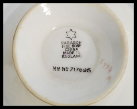 A vintage early 20th century 1920's Paragon fine bone china tea service consisting of six cup, saucer and side plate trios, along with further three side plates and two large cake plates.