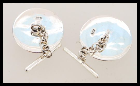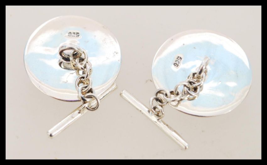 A pair of silver cufflinks with enamel panels featuring foxes. The cufflinks have a chain link fastening and are approximately 1.5cm in diameter.