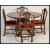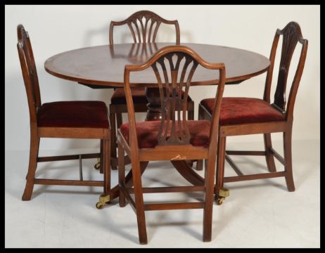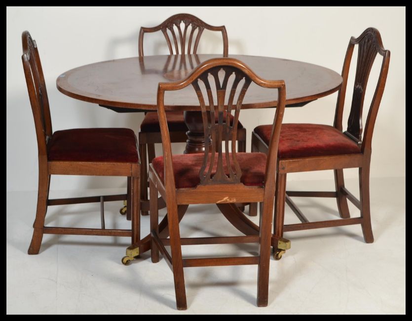 An early 20th century Edwardian plum mahogany and marquetry inlaid  tilt top circular dining table having boxwood inlay. Central cartouche depicting a urn with inlaid borders. Together with a set ogf four carved mahogany dining chairs. Table raised on a quadruped splayed base with brass mounts.