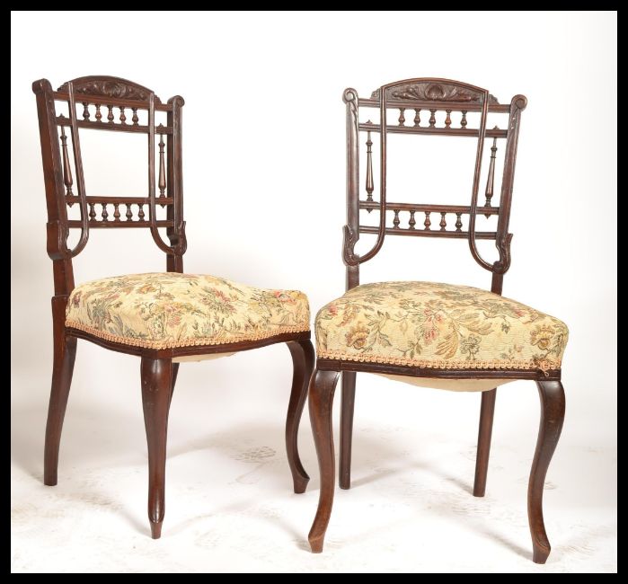 A set of four early 20th Century Edwardian mahogany dining chairs, over stuffed seat pads with gallery spindle backs together with a matching nursing chair.