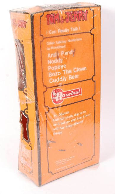 A rare vintage Rosebud made ' Tom & Jerry ' figure set. ' I Can Really Talk '. Appears factory sealed, within the original wrapping (some tape repairs). Talking feature not working. Box measures approx; 56cm tall. Rare.