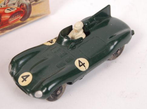 A rare vintage Crescent Toys made diecast model No. 1292 ' D Type Jaguar '. Green, with No.4 decals and driver present. Model generally near mint to very near mint. Within the original Crescent Toys box. Rare model.