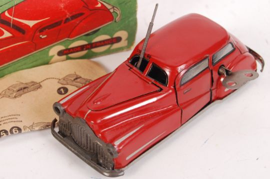 A charming vintage French made c1950's clockwork tinplate ' 2002 Auto-Miracle ' toy car. Made by Joustra , but distributed by Shackman & Co, USA. Red, with opening door and bonnet. Full working order, with original key. The 'auto-miracle' drives along, stops to pick up the passenger and continues its journey. With the original instruction manual present, and within the original box. Rare, superb.