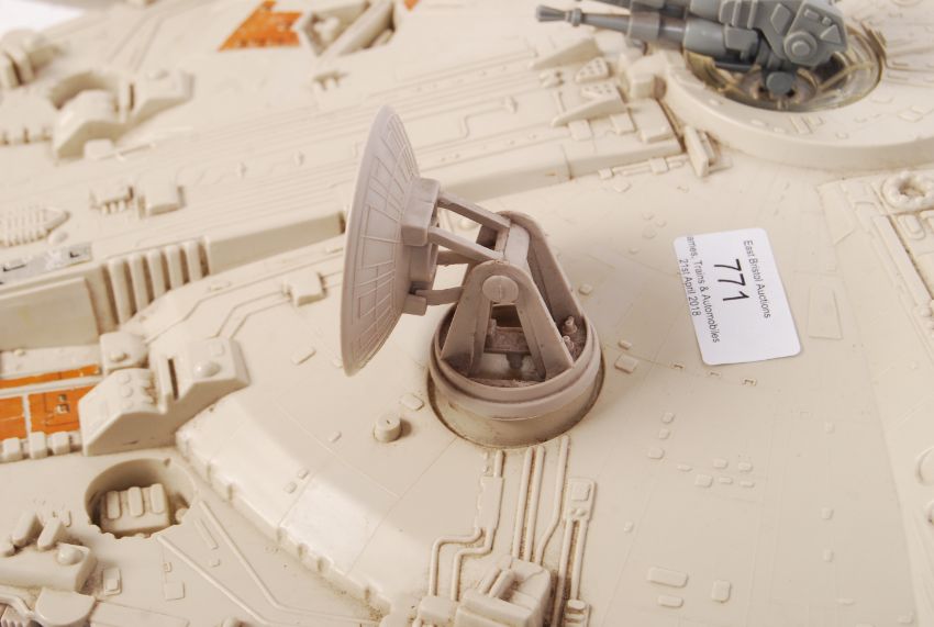 A good original vintage Kenner / Palitoy made Star Wars action figure playset ' Millennium Falcon .' Largely complete, the set is just missing the Jedi Training Ball & Arm. Many of the original decals remain present, and condition is physically very good (no splits / damage). Complete with upper gun, satellite dish, struts, floor panel, access ramp, and canopy cover.