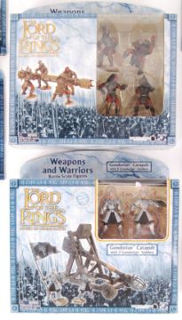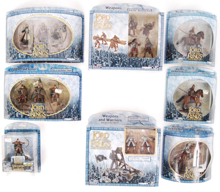 A good collection of 8x assorted Play Along made ' Lord Of The Rings ' ' Battle Scale Figures ' figure sets. All highly detailed, within the original boxes and unused. Comprising of: Uruk-hai Battering Ram, Gondorian Catapult, Gondorian Soldiers, Men Of The Rohan Army, Gondorian Horseman, Rohan Horseman x2, and Rohan Archer. All mint and unused.