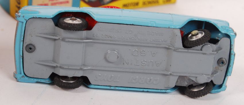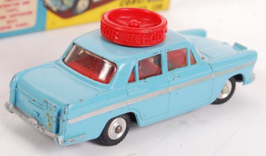An original vintage Corgi Toys made diecast model No. 236 ' Corgi Motor School ' Austin A60. Blue, with silver stripe and red wheel to top. Model generally good to good+, within a good original box.