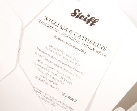 A rare Limited Edition Danbury Mint Steiff ' Royal Wedding Bear 2011 '. 25cm tall. Blonde, with medallion. All tags present, with certificate and decorative sack. Within the original box.