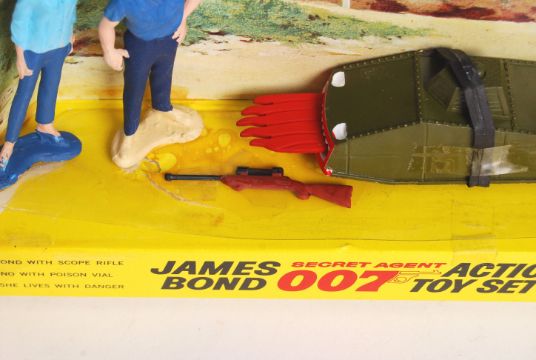 A rare vintage 1965 Gilbert & Co made ' Secret Agent James Bond 007 - Action Toy Set No.4 ' featuring ' James Bond With Scope Rifle, Evil Dr No With Poison Vial, Domino - She Lives With Danger, PLUS Fire Spitting Dragon Tank .' Contents appear mint and unused, within a near mint original display box (some lifting to the plastic base which holds the figure). Rare.