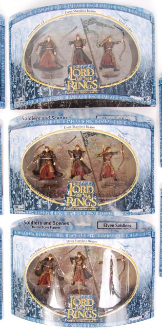A collection of 8x assorted Play Along made ' Lord Of The Rings ' ' Battle Scale Figures ' figure sets. All highly detailed, within the original boxes and unused. Comprising of: Elven Soldiers x5, Men Of The Rohan Army, Gondorian Soldiers, and Easterling Warriors . All mint and unused.