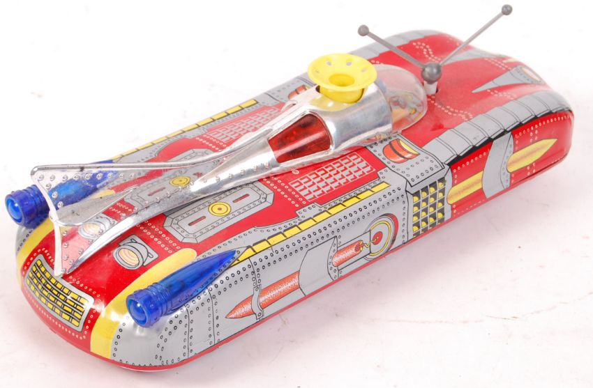 A vintage Japanese (or possibly Russian) made tinplate battery operated spaceship. Lights, sound and air-blowing feature. Fully working order. Litho-printed tin construction, with plastic detailing. Measures approx; 34cm long.