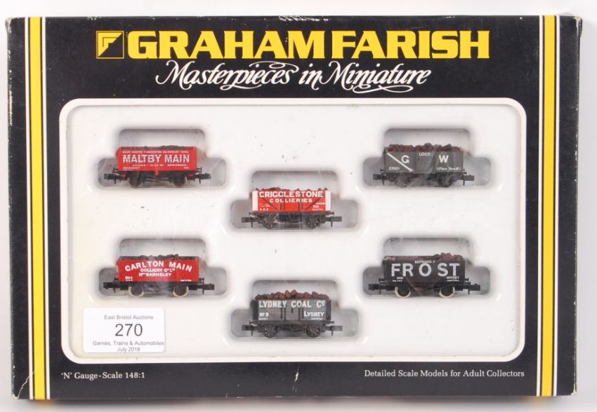 A Graham Farish made N Gauge railway trainset rolling stock wagon set FA 73111 ' Mini Set 6 Coal Wagons '. Within the original display box. Complete.