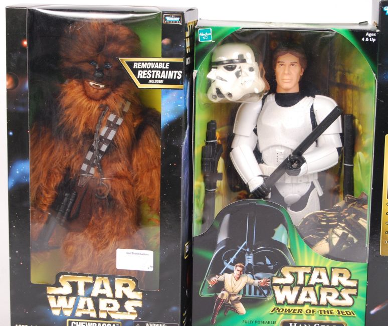 A collection of 4x Kenner made Star Wars 12" action figures. All appear mint and factory sealed, within the original boxes. Comprising of; Chewbacca, Power Of The Jedi Han Solo, Power Of The Force Luke Skywalker, and Luke Skywalker. Sealed.