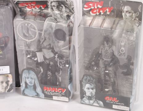 A collection of 4x NECA made ' Reel Toys ' carded / boxed Sin City action figures. Comprising: Yellow Bastard, Gail, Nancy, and Manute. Along with a Sin City ' Underground Toys ' made Nancy action figure. All factory sealed, with contents mint.