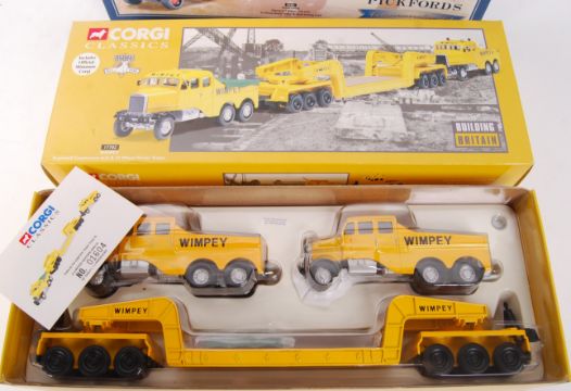 Two Corgi Classics ' Haulage ' related boxed diecast model sets: Building Britain 17702 ' Wimpey Scammell Constructor ' and ' Pickfords ' 55201 ' Diamond T Ballast With 24 Wheel Girder Trailer '. Both appear mint and complete, within the original boxes. With certificates.
