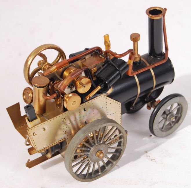 A superb German made ' Lutz Hielscher ' live steam traction engine. Brilliantly engineered, in steel and brass. Appears complete, but is sold as unchecked. Makers marks to front of boiler. Very intricate detail allover. Front wheels have no securing nuts. Measures approx; 12cm long in total. Rare engine.