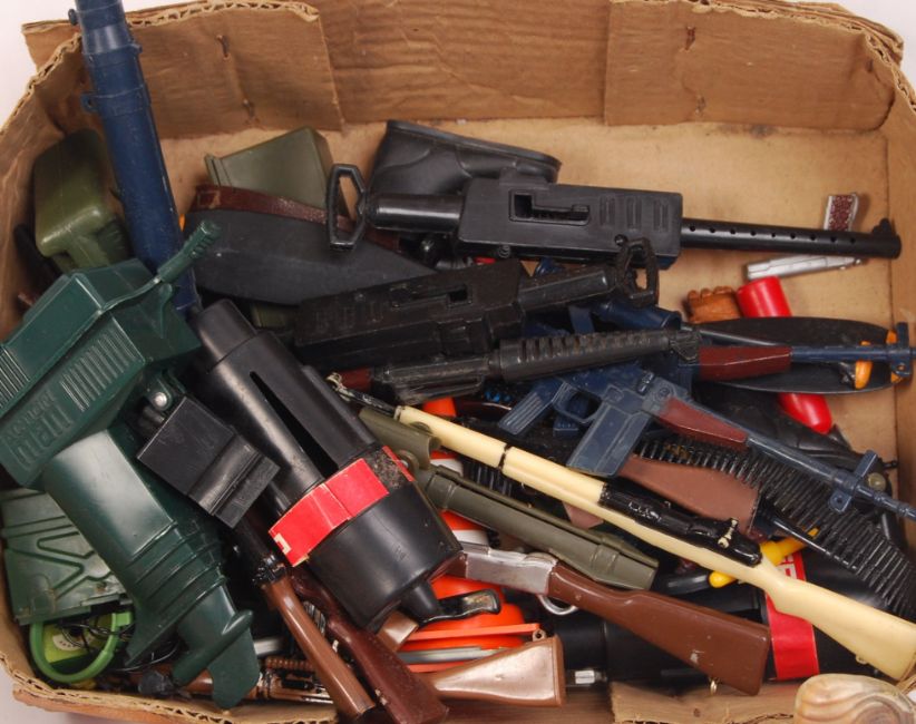 A good large collection of assorted original vintage Palitoy made ' Action Man ' clothing, weapons , vehicles and accessories to include 4x figures , 3x Husky's with an array of military clothing.