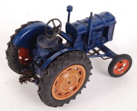 An original rare Chad Valley made diecast Fordson Major clockwork tractor. Original blue colour, with clockwork mechanism, wound by the 'starting handle' to front. Original Chad Valley label to underside. Clockwork mechanism in working order (drives one wheel). Rare. Measures approx; 19cm long.