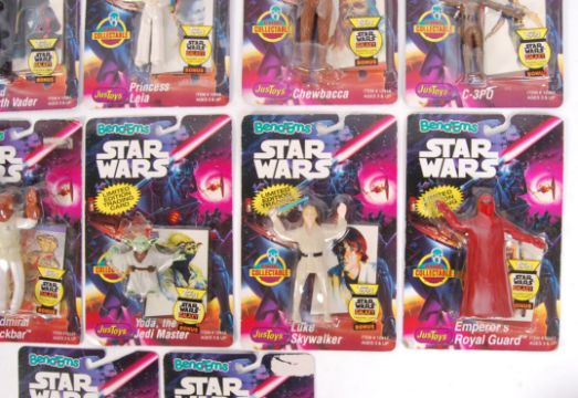 A collection of 12x original vintage carded Star Wars ' Bend Ems ' action figures by Justoys. To include; Obi Wan Kenobi, Luke Skywalker, Yoda, Darth Vader and others. All contents mint and unused, all still factory sealed upon their original cards.