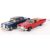 An original vintage Japanese issued (made in Korea) tinplate battery operated Bandai ' Kingsize Cadillac ' car. Unboxed. Along with a similar age battery operated tinplate and plastic Mercedes, in blue. Both untested (Mercedes battery box AF). Longest measures approx; 33cm long.