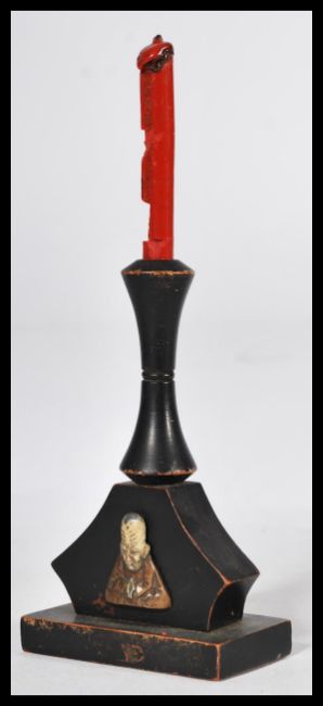An early 20th century Chinese wax seal holder raised on a square plinth base with mask of an elder with elongated head to front. Complete with red wax seal. Measures 20.5 cm high.